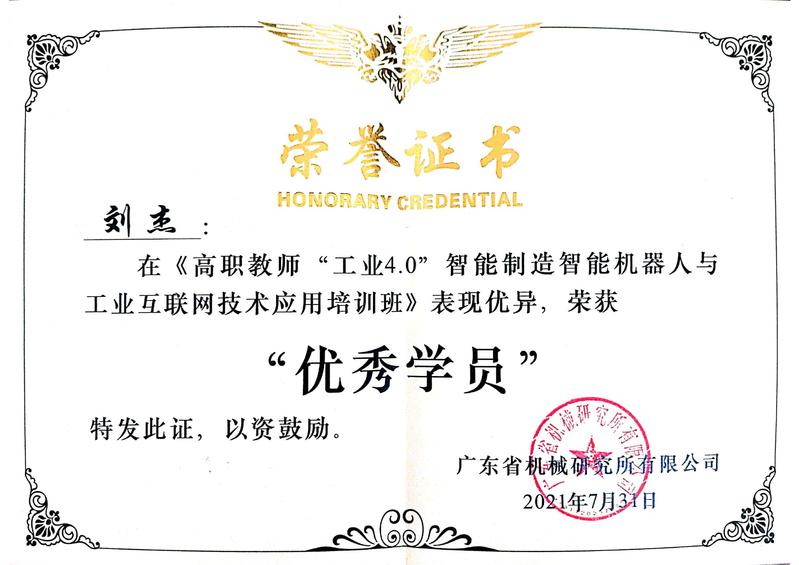 通過此次培訓(xùn),兩位教師對智能制造智能機(jī)器人和工業(yè)互聯(lián)網(wǎng)技術(shù)技能提升、把握職業(yè)教育方向,促進(jìn)專業(yè)升級、課程開發(fā)、1+X證書等方面都有了一定的收獲,其中劉杰老師獲得“優(yōu)秀學(xué)員”,林祥智老師獲得“學(xué)習(xí)之星”。