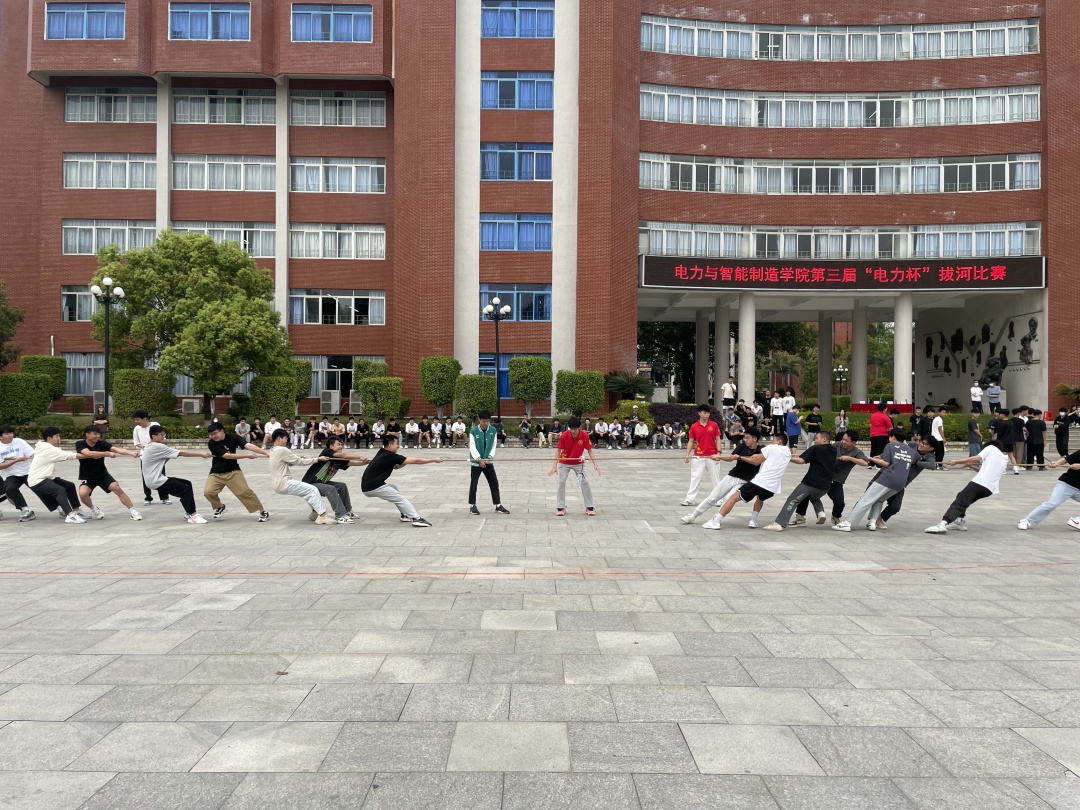 比賽有序進(jìn)行,裁判哨子吹響;此時(shí),雙方隊(duì)員齊聲高喊口令,大家齊心協(xié)力,卯足勁將繩子向自己方向拉;雙方啦啦隊(duì)為自己班級(jí)加油助威。加油聲、吶喊聲響切徘徊在廣場(chǎng)。