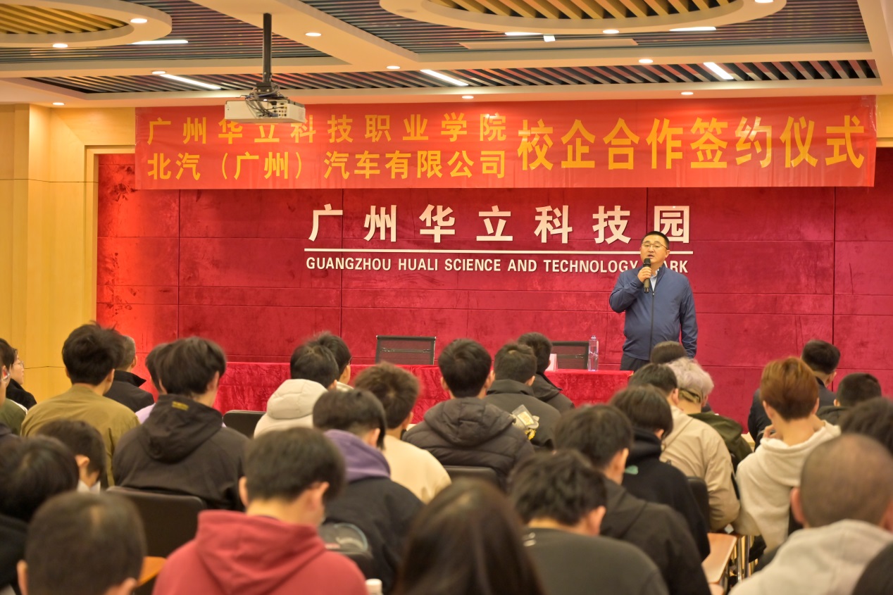 出席此次簽約儀式的領(lǐng)導(dǎo)有北汽(廣州)汽車有限公司黨委書記、總經(jīng)理朱百慶,黨委副書記、紀委書記、工會主席陶也,綜合管理部副部長兼安全總監(jiān)宋振濤,人力運營高級經(jīng)理兼信息技術(shù)高級經(jīng)理黃建安;廣州華立科技職業(yè)學院校長陳德清,黨委書記、政府督導(dǎo)專員陳良聲,教學副校長陳顯強,教務(wù)處副處長兼產(chǎn)教融合辦公室主任陳茜,教學實踐科科長韋建林,電力與智能制造學院院長褚玉峰及教學主任、學管主任、新能源汽車專業(yè)的同學代表。