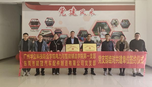 為貫徹落實(shí)黨的二十大精神,全面推進(jìn)基層黨組織建設(shè),落實(shí)新時(shí)代黨的建設(shè)總要求和黨的組織路線,增強(qiáng)學(xué)院黨組織的凝聚力和戰(zhàn)斗力,著力構(gòu)建黨組織間互幫互助的常態(tài)化,形成“優(yōu)勢(shì)互補(bǔ),共同提升”黨建工作的新格局。2024年1月5日,廣州華立科技職業(yè)學(xué)院電力與智能制造學(xué)院(以下簡稱“電力學(xué)院”)第一黨支部與東莞市箭冠汽車配件制造有限公司(以下簡稱“箭冠公司”)黨支部,在箭冠汽車配件制造有限公司創(chuàng)業(yè)樓黨建活動(dòng)會(huì)議室,隆重舉行了“黨建工作結(jié)對(duì)共建活動(dòng)”簽約儀式。箭冠汽車配件制造有限公司是我校的校企合作單位,黨建工作在當(dāng)?shù)孛駹I企業(yè)中很有名氣。