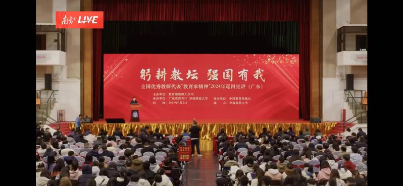 本次巡回宣講活動來到華南師范大學(xué),由6位全國優(yōu)秀教師結(jié)合工作實際,分享了扎根講臺、潛心育人的感人故事,激勵廣大人民教師踐行教育家精神。
