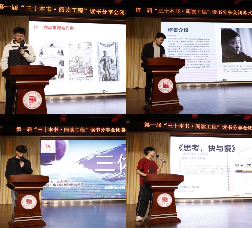 本次讀書分享會安排了初賽獲得“一等獎”的薛子政、鄭希煌、王天碩、林文錦四位同學(xué)進行讀書分享,他們分享的書籍分別是《格列佛游記》、《思考,快與慢》、《活著》、《三體》。同學(xué)們通過分析書籍人物情節(jié),結(jié)合自身閱讀理解和感受,借助PPT圖文并茂地為大家?guī)硪粓鍪斋@滿滿的閱讀盛宴。