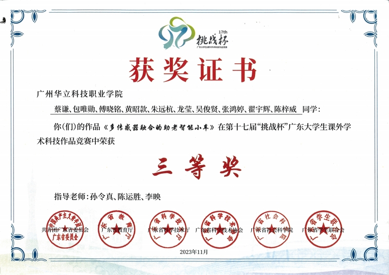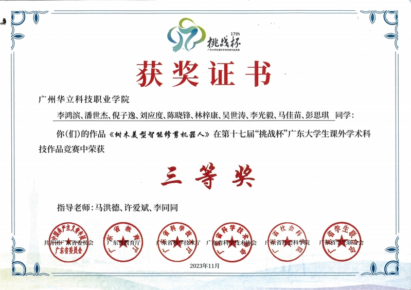 近期,在第十七屆“挑戰(zhàn)杯”廣東大學生課外學術科技作品競賽中,電力與智能制造學院兩件參賽作品《樹木美型智能修剪機器人》、《多傳感器融合的助老智能小車》均榮獲省級三等獎。