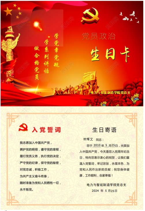 作為電力與智能制造學(xué)院黨總支教師黨支部的一名教師黨員林輝文,5月25日早上,收到了學(xué)院黨組織發(fā)的“政治生日”賀卡,心情特別興奮,2010年5月25日是我加入中國(guó)共產(chǎn)黨的日子。