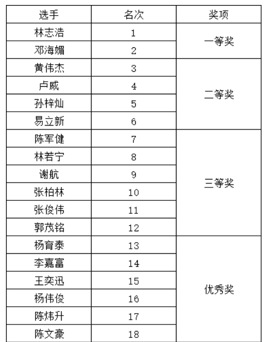 評委現(xiàn)場評分,經(jīng)過一下午的緊張比賽,最終林志浩、鄧海媚同學(xué)獲得“一等”獎,還有16名同學(xué)分別獲得“二等獎”、“三等獎”及“優(yōu)秀獎”。