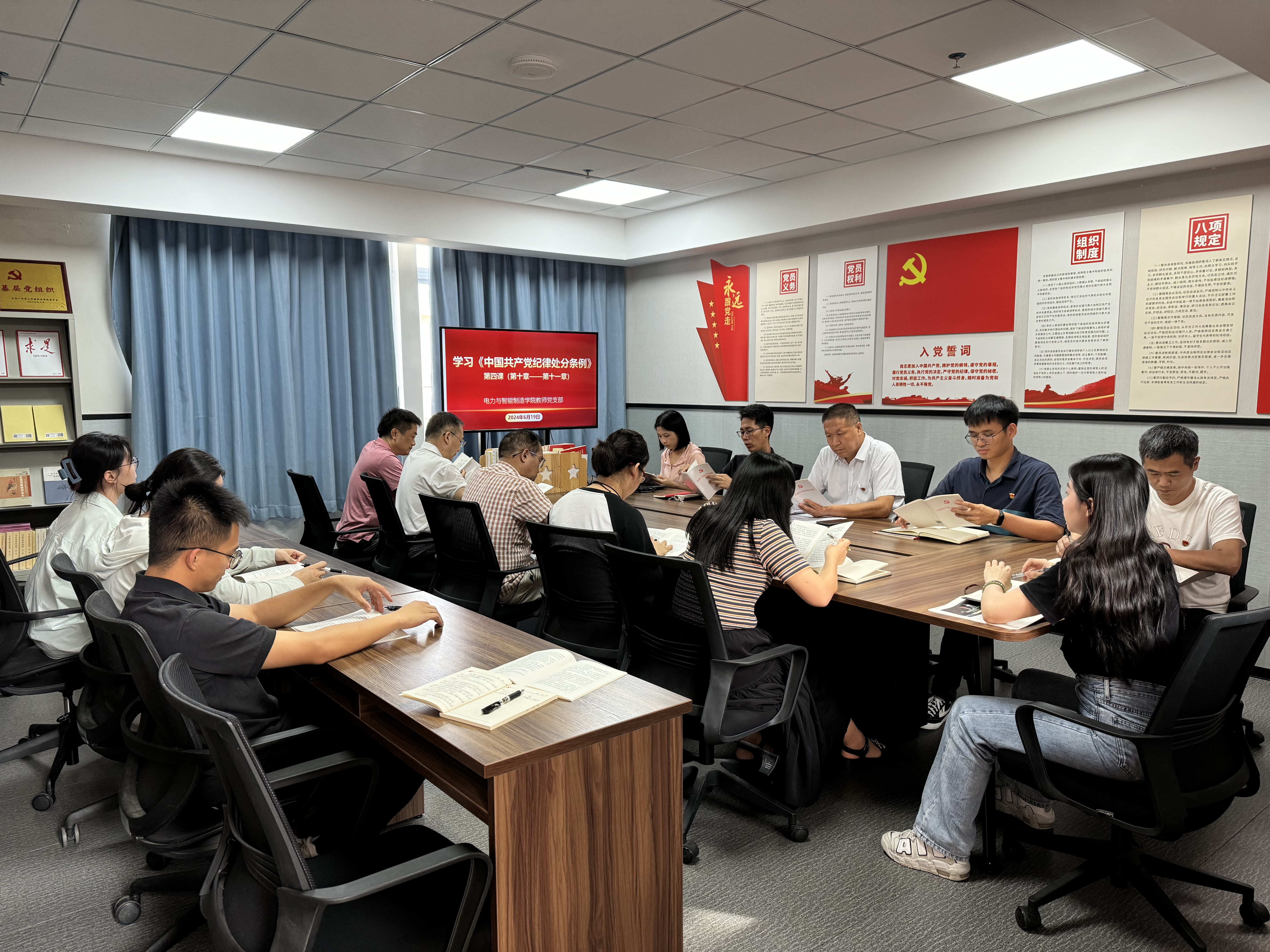 按照電力與智能制造學(xué)院黨總支《黨紀(jì)學(xué)習(xí)教育學(xué)習(xí)計劃》的安排部署,6月19日下午在西一樓514B黨員活動室,學(xué)院教師黨支部組織學(xué)習(xí)《中國共產(chǎn)黨紀(jì)律處分條例》第四節(jié)課,教師黨支部全體黨員參加了會議,會議由教師黨支部書記孫令真主持。