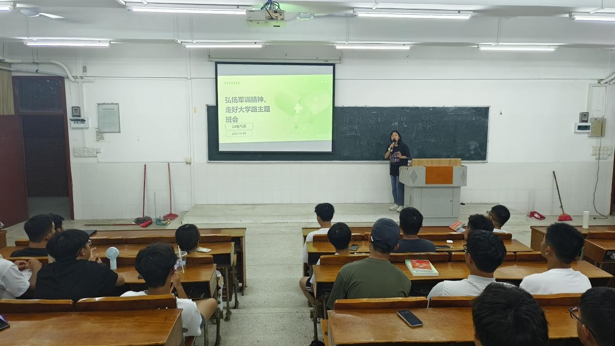 2024年級新同學(xué)軍訓(xùn)已經(jīng)勝結(jié)束,電力學(xué)院黨總支為使同學(xué)們能將在軍訓(xùn)中形成的良好作風(fēng)和習(xí)慣,繼續(xù)保持下去,應(yīng)用到大學(xué)生活中,要求全院新生輔導(dǎo)員共同開展“弘揚(yáng)軍訓(xùn)精神,走好大學(xué)路”主題”班會。
