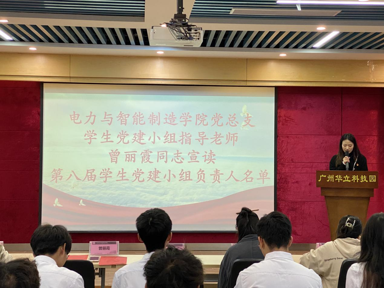 會議第一項議程全體起立奏唱國歌。然后鄭理廣同志上臺致辭,他講到,學生黨建小組是學院黨建工作的重要力量,通過組織主題活動、志愿服務和政治理論學習等活動,為學生創(chuàng)造了解黨的知識和歷史的平臺。加入黨建小組既是榮譽也是責任,希望同學們珍惜機會,加強政治理論學習,嚴格要求自己,勇于創(chuàng)新,在為同學們的服務中,不斷提升自己政治修養(yǎng)。接著,曾麗霞老師宣讀第八屆黨建學生干部名單,并由鄭理廣同志為學生干部們頒發(fā)工作牌。