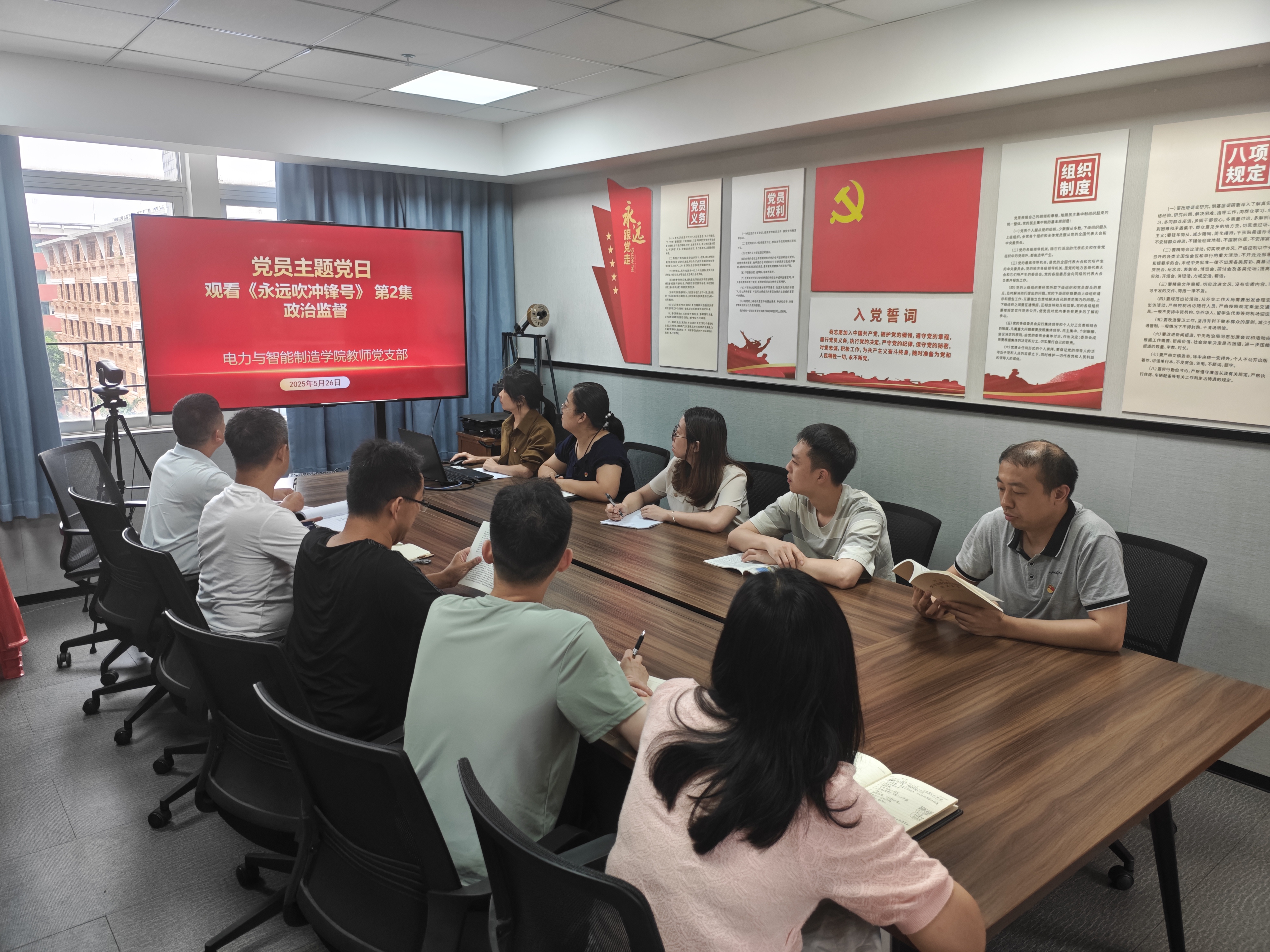 為深入貫徹中央八項規(guī)定精神學(xué)習(xí)教育,推進(jìn)作風(fēng)建設(shè)常態(tài)化長效化,5月26日下午,電力與智能制造學(xué)院教師黨支部開展主題黨日活動——觀看警示教育片“《永遠(yuǎn)吹沖鋒號》專題片第2集——《政治監(jiān)督案》”,此次主題黨日活動由林輝文副書記主持。