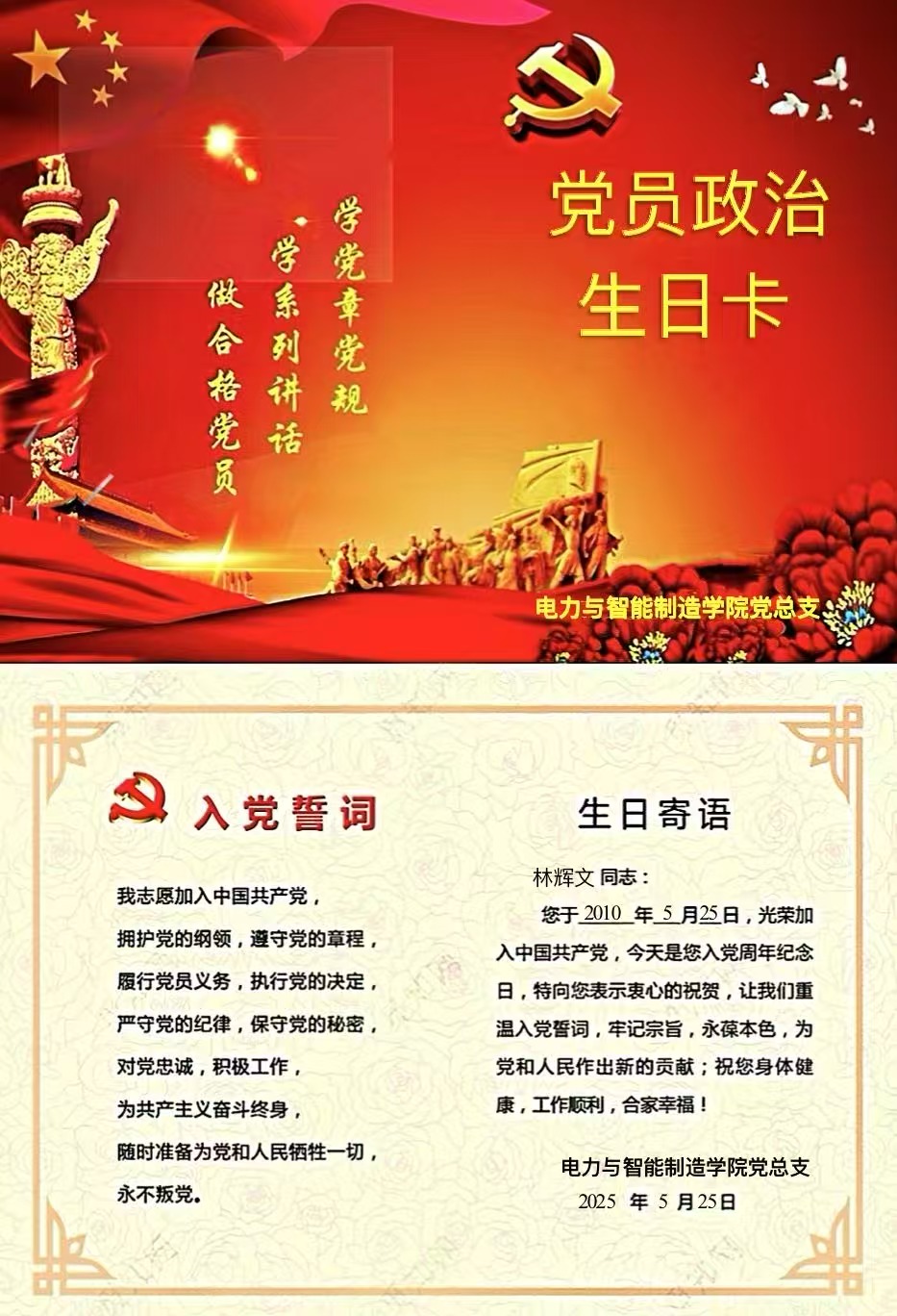 作為電力與智能制造學(xué)院的一名教師黨員林輝文,5月25日上午,收到了學(xué)院黨組織發(fā)的“政治生日”賀卡,心情特別興奮,2010年5月25日是我加入中國(guó)共產(chǎn)黨的日子。