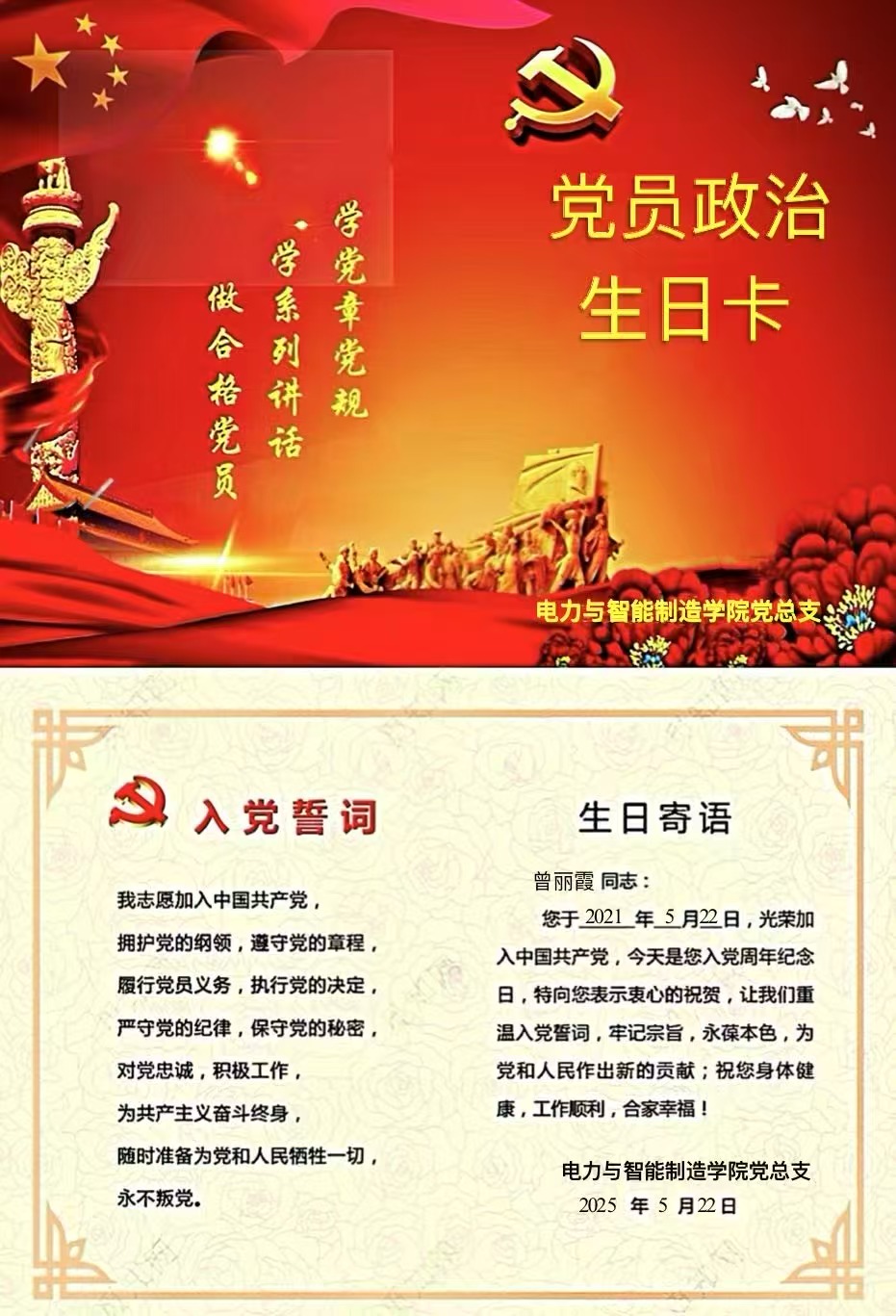 2021年5月22日,是我加入中國共產(chǎn)黨的日子。2025年5月22日早上收到學(xué)院黨組織的“政治生日”賀卡,我的內(nèi)心萬分地激動和感動,讓我仿佛回到了入黨時的那個神圣時刻。