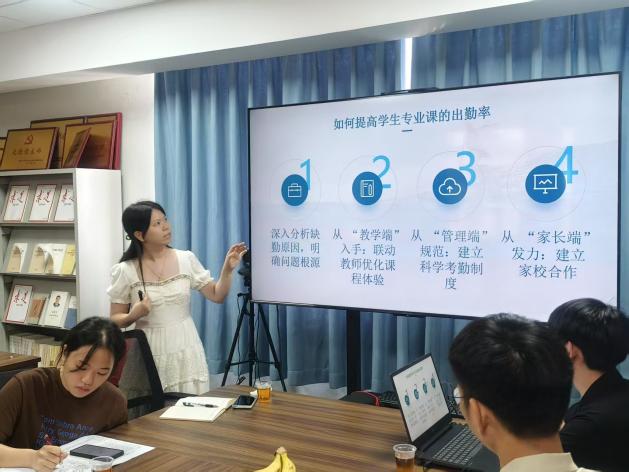 輔導員王曼霞老師分享了如何提高學生專業(yè)課的出勤率。從分析問題根源、教學端、管理端、家長端四個方面進行講解。強調(diào)提高學生專業(yè)課出勤率是保障教育效果、促進學生全面發(fā)展的重要條件之一。