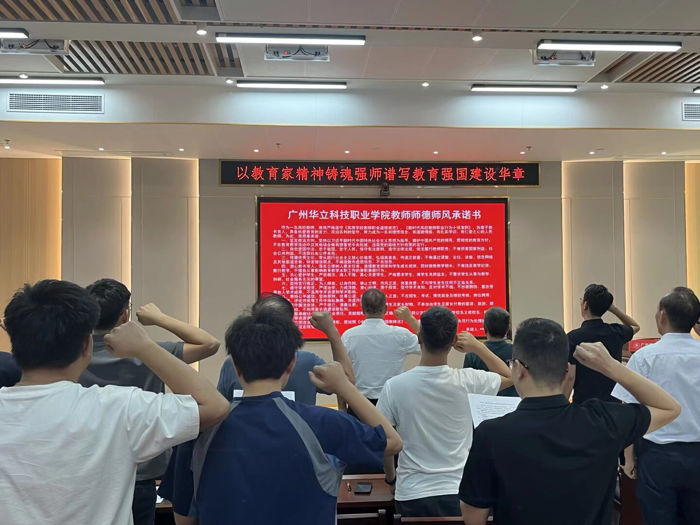 首先,全體教師共同承諾《廣州華立科技職業(yè)學(xué)院教師師德師風(fēng)承諾書》,老師們以莊重的聲音立誓:嚴(yán)格遵守《高等學(xué)校教師職業(yè)道德規(guī)范》、《新時(shí)代高校教師職業(yè)行為十項(xiàng)準(zhǔn)則》,努力成為有理想信念、有道德情操、有扎實(shí)學(xué)識、有仁愛之心的人民教師。