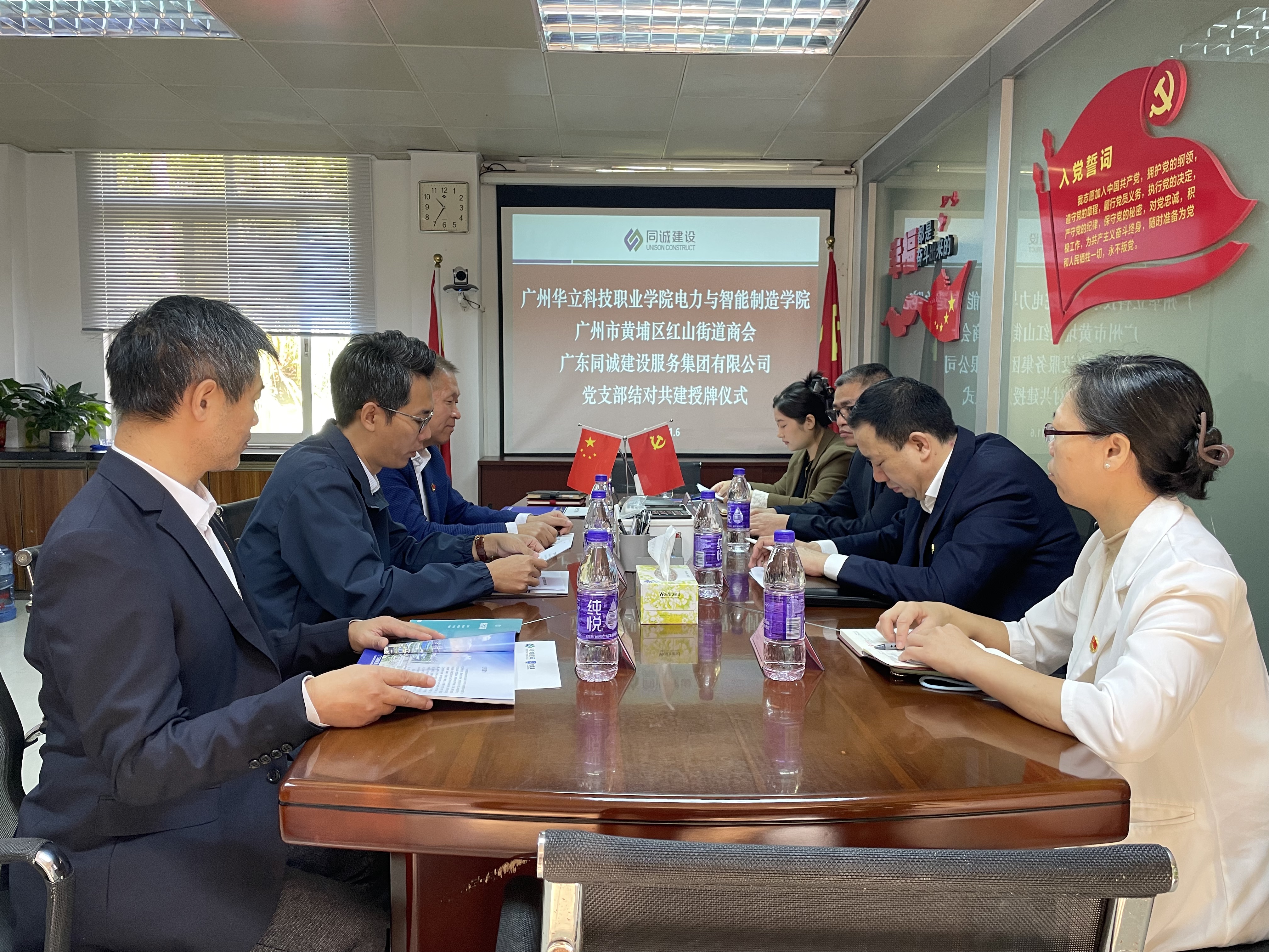 為深入推進(jìn)學(xué)院“雙帶頭人”教師黨支部書記“廣東行”專項行動,更好發(fā)揮“雙帶頭人”教師黨支部書記的示范引領(lǐng)作用,促進(jìn)校企黨建工作交流與合作。11月6日,電力與智能制造學(xué)院教師黨支部與廣州市黃埔區(qū)紅山街道商會、廣東同誠建設(shè)服務(wù)集團(tuán)有限公司黨支部,在廣東同誠建設(shè)服務(wù)集團(tuán)有限公司會議室舉行了結(jié)對共建儀式。