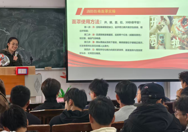 培訓中,實訓室管理員陳曉欣老師結合實訓室日常管理實例,詳細解讀了儀器設備操作規(guī)程,實訓室安全管理須知,重點強調了消防安全“預防為先、防消結合”的基本原則。針對實訓室可能出現(xiàn)的電氣設備故障火災等突發(fā)情況,管理員現(xiàn)場演示了防毒面具的正確佩戴步驟,講解了滅火器的使用方法,逐一拆解操作要點,每位來講座的班級代表成為班級安全知識的“傳播員”。