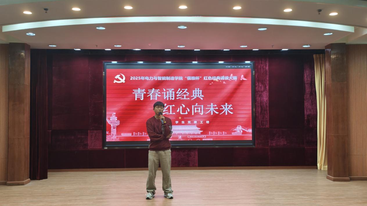 為貫徹落實黨的二十大精神,傳承紅色基因,賡續(xù)紅色血脈。12月18日,電力與智能制造學(xué)院舉辦了以“青春誦經(jīng)典,紅心向未來”為主題的“儒雅杯”紅色精典誦讀大賽。參加本次大賽的有:學(xué)院黨總支書記褚玉峰,黨總支專職副書記、學(xué)管主任鄭理廣,團委書記王明偉,學(xué)生黨建工坊指導(dǎo)老師王凱,25級輔導(dǎo)員以及學(xué)生代表,大賽由學(xué)院學(xué)生黨建工坊承辦。