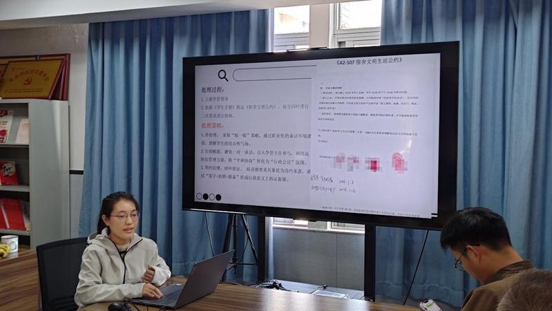 輔導(dǎo)員郭曉倩老師分享了宿舍矛盾處理的經(jīng)驗(yàn),在班級(jí)行政管理中引入高階管理力量,協(xié)助解決復(fù)雜問(wèn)題,在一線工作中,通過(guò)依托規(guī)章制度開(kāi)展管理,發(fā)揮秩序維護(hù)作用。