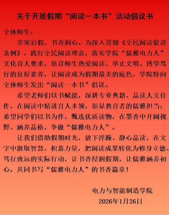 1月26日,臨近放假,電力與智能制造學(xué)院在西1-514會(huì)議室舉行“假期閱讀一本書(shū)”活動(dòng)啟動(dòng)儀式,學(xué)院廣州校區(qū)的全體教師參加了會(huì)議,云浮校區(qū)的教師通過(guò)連線方式也參加了會(huì)議。