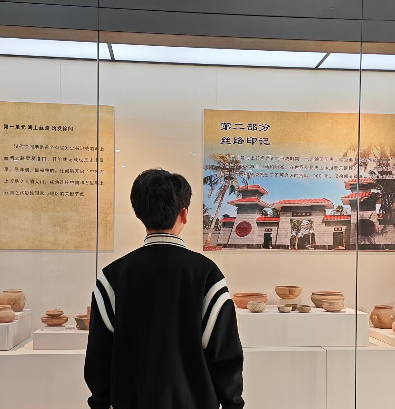 25級電力4班的陳宣任同學(xué),參觀了其家鄉(xiāng)的徐聞縣博物館。他表示,通過觀看“海上絲路始發(fā)徐聞”和“絲路印記”等實物擺件和照片,消除了他對這段歷史的陌生感。原來早在漢代,徐聞這座港口就已成為官方記載的海上絲路起點,那些被精心擺放的陶器,或許曾裝載過絲綢與瓷器,順著季風(fēng)駛向東南亞乃至更遠(yuǎn)的海域。同時他表示,博物館里的物件,不再是冰冷的古物,而是鮮活的見證,讓他真切地觸摸到“萬里絲路”不是書本里的抽象概念,而是由無數(shù)艘商船、無數(shù)次遠(yuǎn)航編織成的文明紐帶。而當(dāng)他走出展廳時,陽光透過玻璃灑在那些陶器上,泛起溫潤的光澤。讓他忽然間明白,博物館的意義,正是讓我們在與歷史的對話中讀懂自己——徐聞港的帆影早已遠(yuǎn)去,但它留下的開放與探索精神,依然在今天的海風(fēng)中延續(xù)著。
