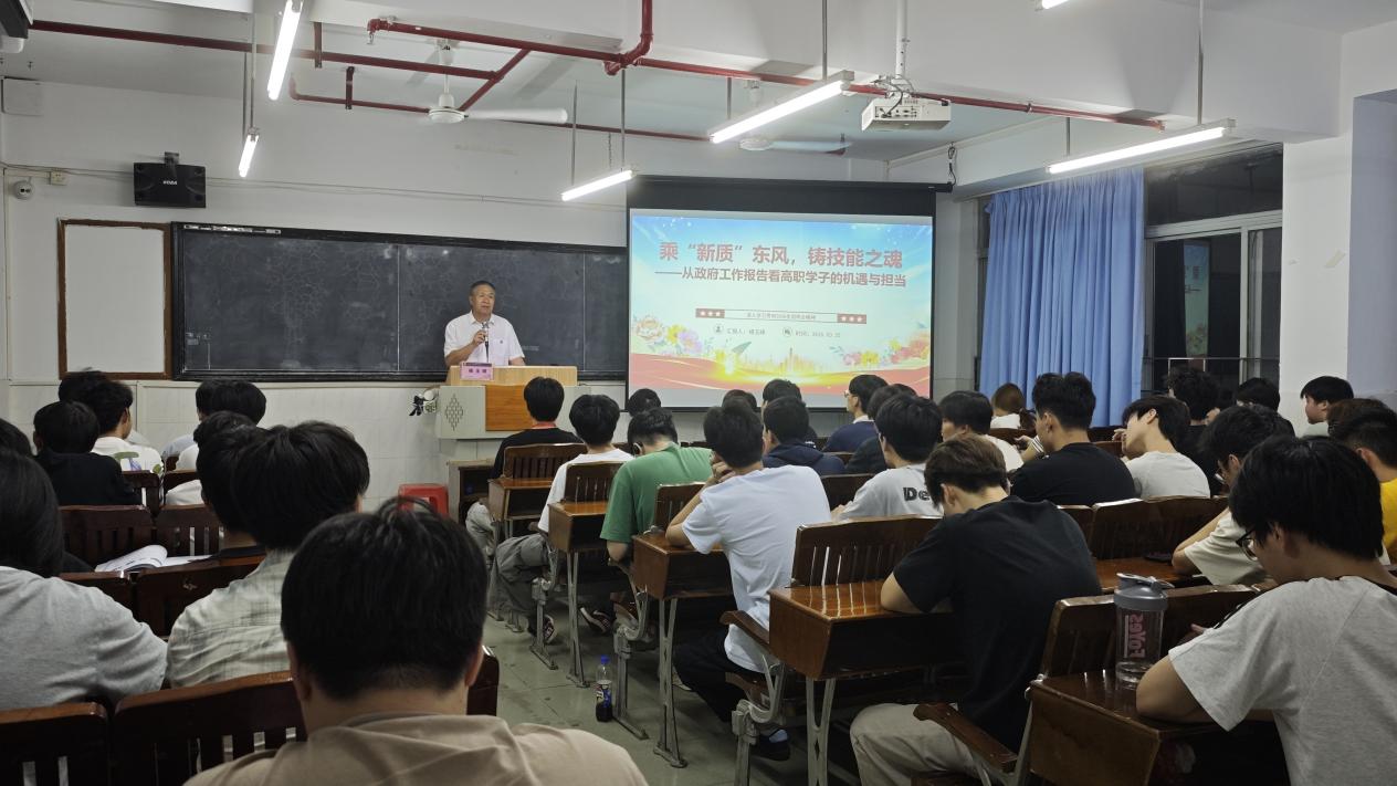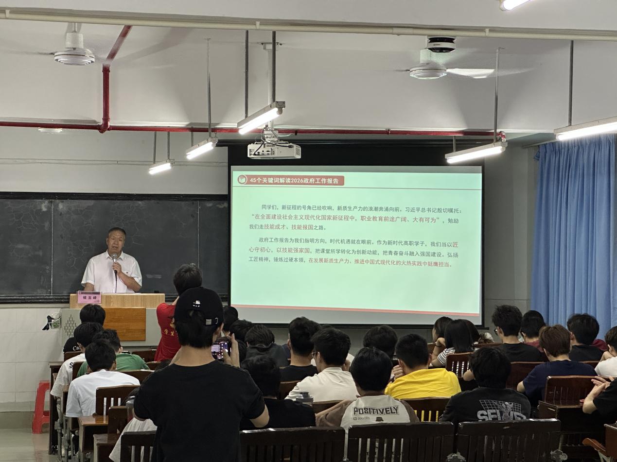 為深入學(xué)習(xí)貫徹2026年全國兩會(huì)精神,幫助我院學(xué)子找準(zhǔn)時(shí)代定位、明確技能成才方向,3月25日,電力與智能制造學(xué)院在西一403課室開展春季學(xué)期“思政第一課”專題學(xué)習(xí)。學(xué)院黨總支書記褚玉峰以《乘“新質(zhì)”東風(fēng),鑄技能之魂——從政府工作報(bào)告看高職學(xué)子的機(jī)遇與擔(dān)當(dāng)》為主題,為同學(xué)們講授思政第一課。