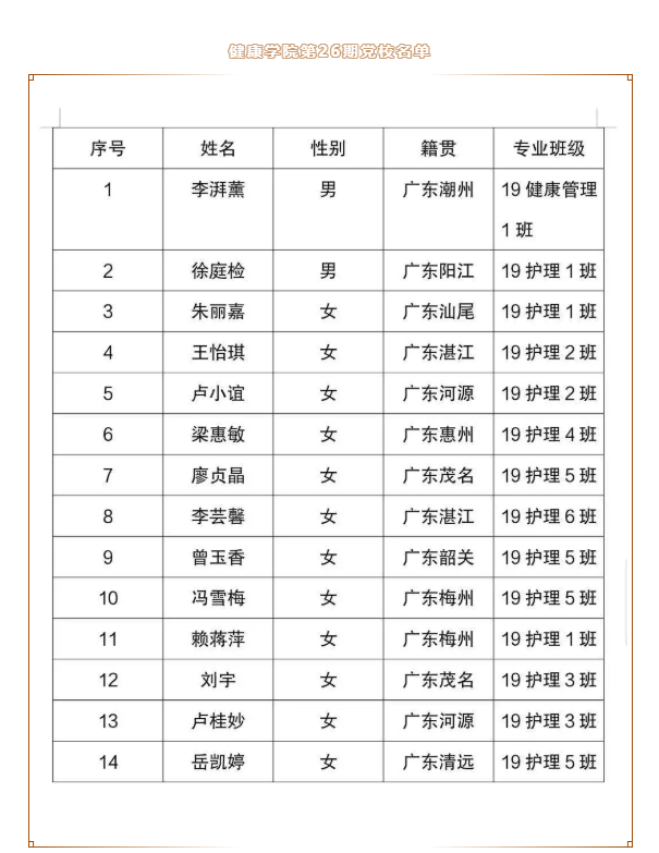 根據(jù)學(xué)校黨委相關(guān)文件規(guī)定,經(jīng)學(xué)生本人申請、團(tuán)支部推薦、輔導(dǎo)員推薦、黨支部考察、黨總支研究決定、擬將我院李湃薰等14名同學(xué)列為第26期黨校培訓(xùn)班學(xué)員,現(xiàn)將本次培訓(xùn)班學(xué)員的名單公示如下(具體名單見下表)