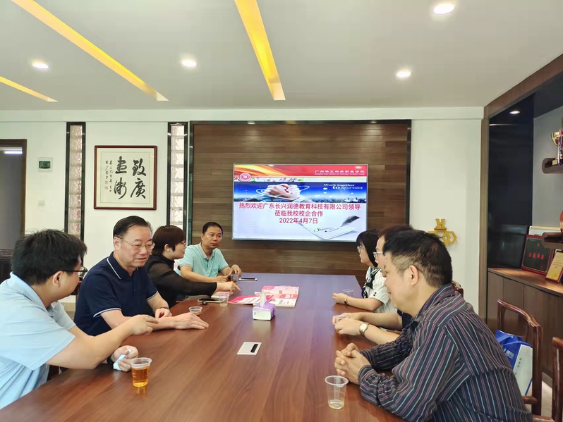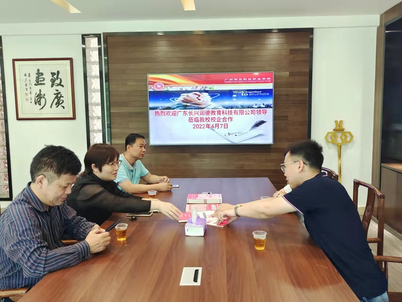2022年4月7日下午,廣州華立科技職業(yè)學院黨委書記林偉健、常務副校長馬俊、健康學院院長雷毅雄、校外教學與就業(yè)處處長鐘文浩、校外教學副主任李景德等與廣東長興潤德教育科技有限公司薛志雨副總一行在行政樓301洽談護士資格證培訓項目,助力畢業(yè)生就業(yè)。