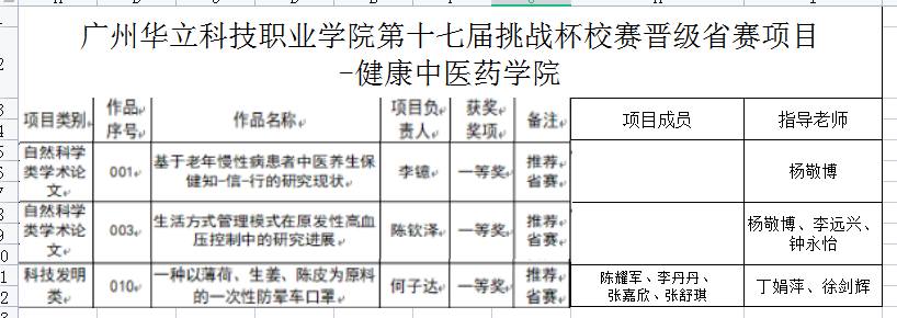 2023年3月22日,廣州華立科技職業(yè)學院組織開展了“第十七屆挑戰(zhàn)杯”大學生課外學術(shù)科技作品競賽,健康/中醫(yī)藥學院老師楊敬博老師、李遠興老師、鐘永怡老師、丁娟萍老師、徐劍輝老師指導三個項目參賽,全部獲得校賽一等獎推薦進入?yún)⒓邮≠悺?/span>