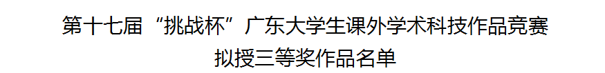 在第十七屆“挑戰(zhàn)杯”廣東大學(xué)生課外學(xué)術(shù)科技作品競(jìng)賽擬授獲獎(jiǎng)作品中,學(xué)校共9個(gè)項(xiàng)目榮獲三等獎(jiǎng)。