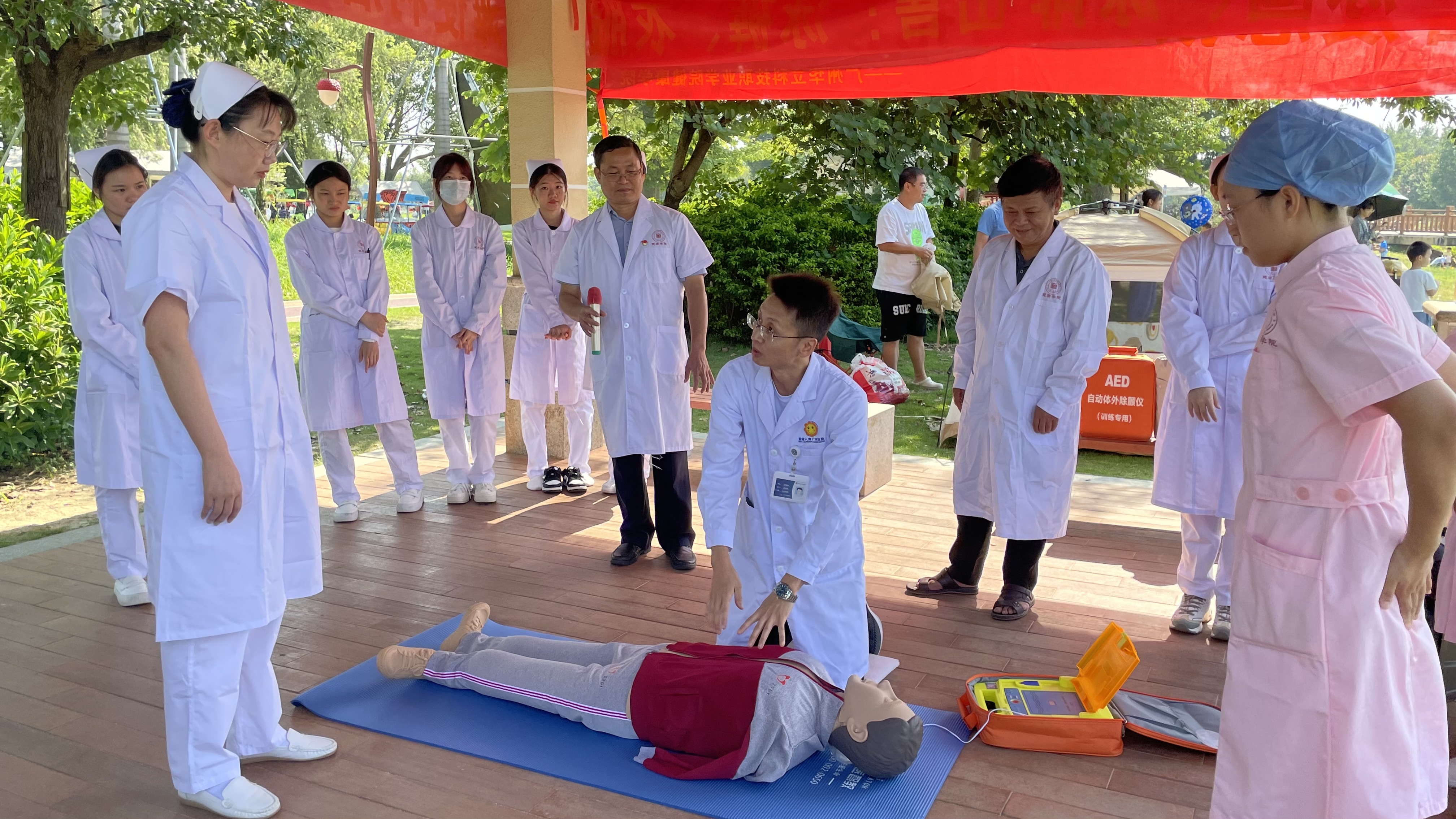 為響應(yīng)國(guó)家普及全民急救知識(shí)號(hào)召,提高增城市民的急救意識(shí)和應(yīng)對(duì)突發(fā)事件的自救、互救能力,切實(shí)把“我為群眾辦實(shí)事”落到實(shí)處,當(dāng)天上午,廣州華立科技職業(yè)學(xué)院健康學(xué)院直屬黨支部書記孟允煌帶領(lǐng)該校健康學(xué)院、中醫(yī)藥學(xué)院直屬黨支部師生黨員,與前海人壽廣州總醫(yī)院專家團(tuán)隊(duì)一道,在增城人工沙灘現(xiàn)場(chǎng),為帶小孩前來游泳和休閑的群眾普及急救知識(shí)。