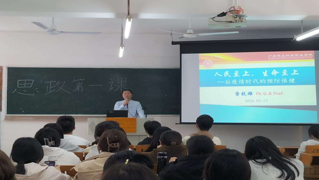 為讓學(xué)生提高預(yù)防保健意識(shí),更好了解“人民至上、生命至上”,2024年3月13日,健康學(xué)院院長雷毅雄結(jié)合專業(yè)知識(shí),以“人民至上、生命至上——后疫情時(shí)代的預(yù)防保健”為主題,在西二203教室為學(xué)院2023級(jí)學(xué)生代表講授2024年春季學(xué)期思政第一課。