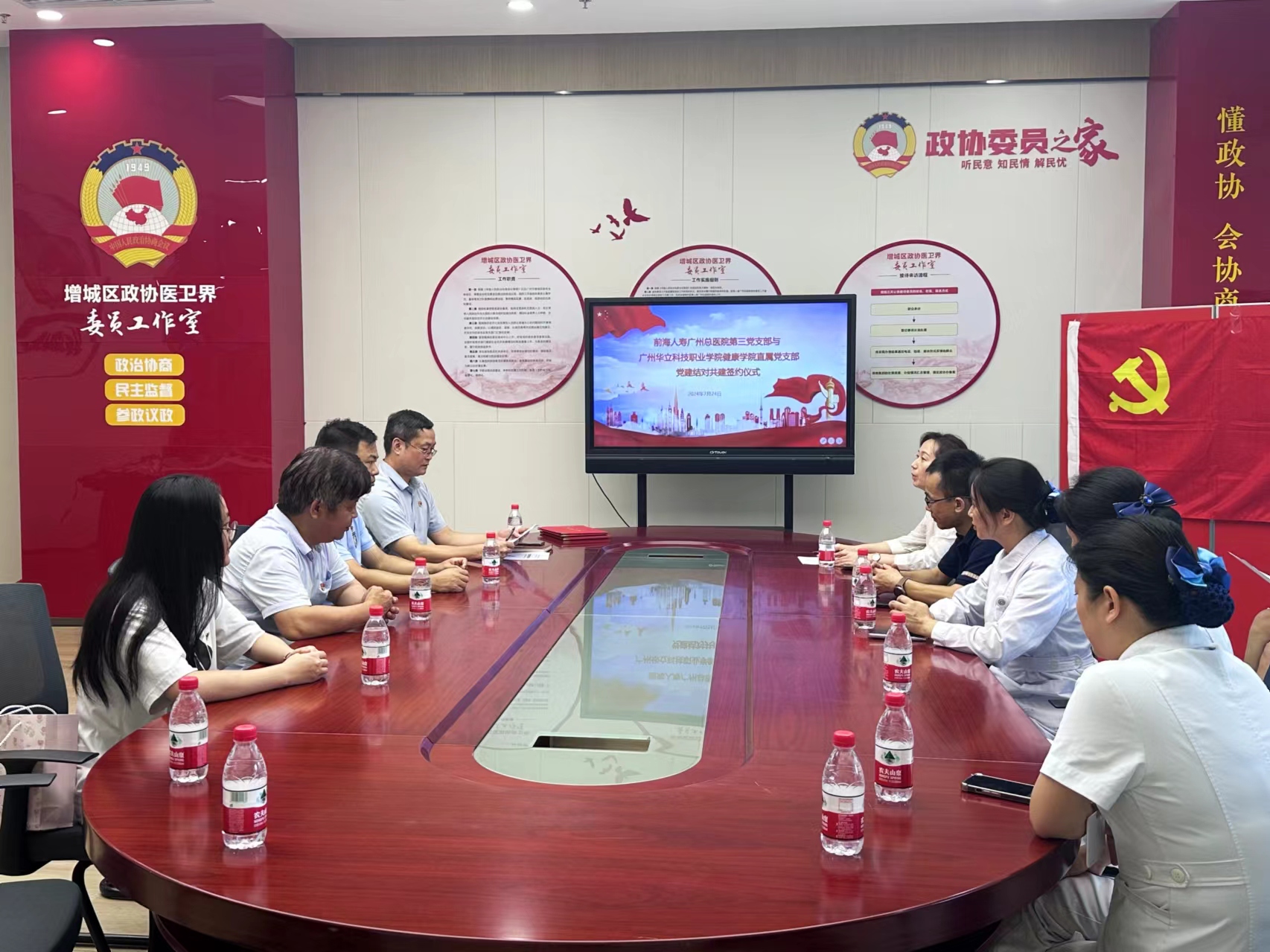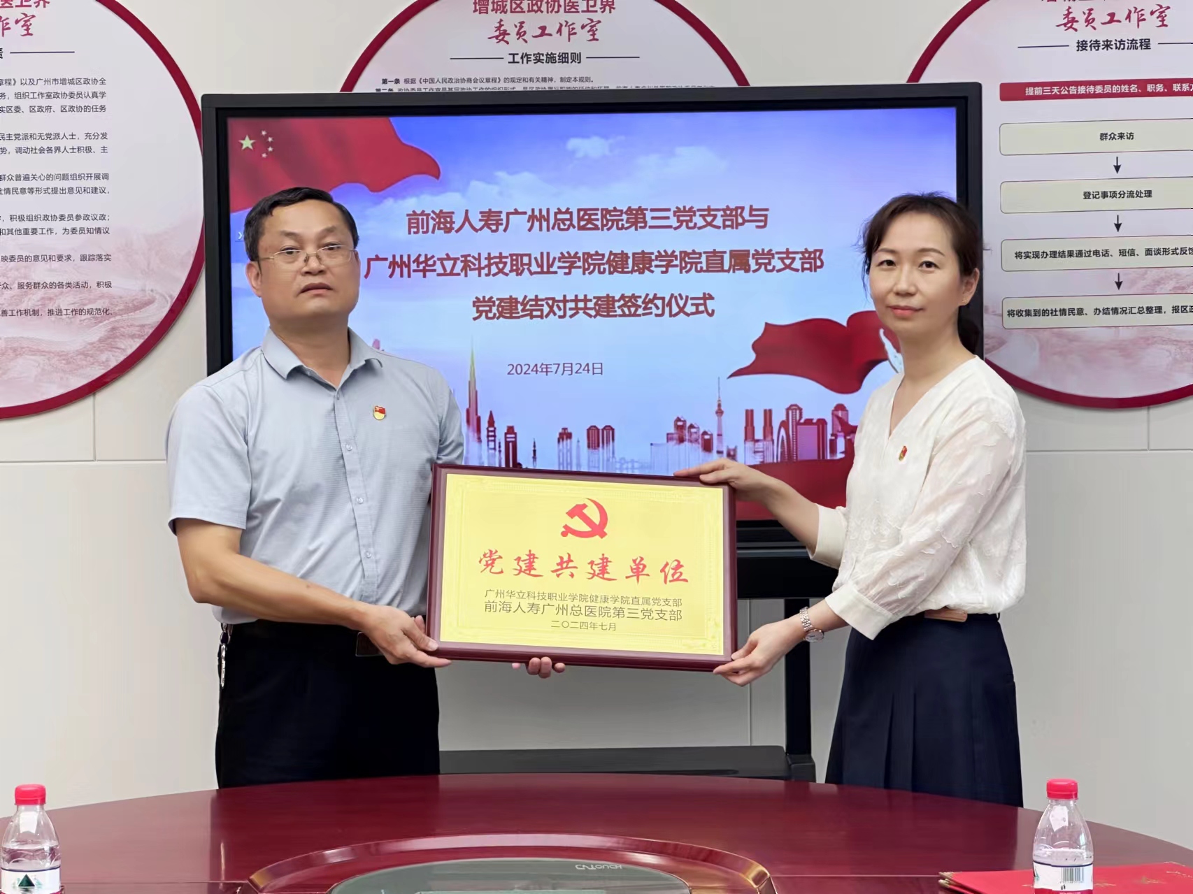 2024年7月24日下午,健康學(xué)院直屬黨支部與前海人壽廣州總醫(yī)院第三黨支部舉行黨建結(jié)對(duì)共建簽約儀式。雙方按照“黨建共建、資源共享”的思路,遵循“優(yōu)勢(shì)互補(bǔ)、互幫互助、聯(lián)學(xué)聯(lián)動(dòng)”的原則,以“我為群眾辦實(shí)事”為抓手,進(jìn)一步加強(qiáng)校醫(yī)合作,更好發(fā)揮兩個(gè)黨支部的戰(zhàn)斗堡壘作用和黨員的先鋒模范作用,攜手創(chuàng)建先進(jìn)基層黨支部。