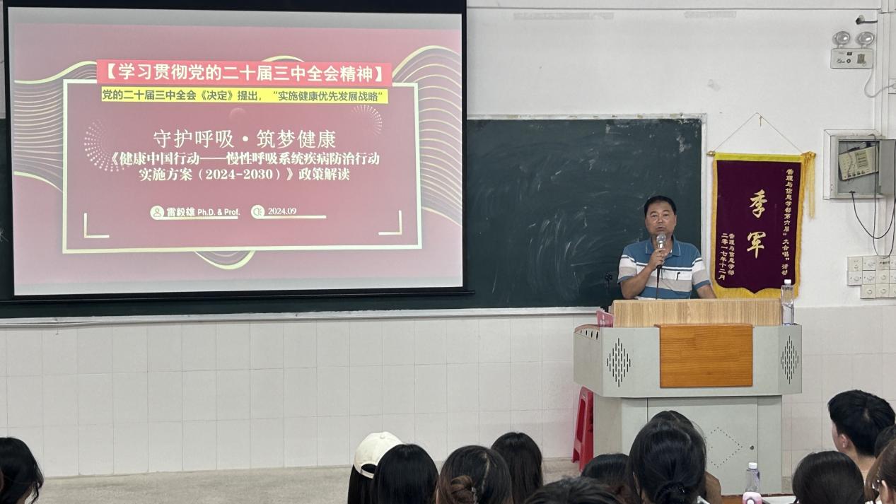 隨后,雷毅雄院長具體解讀了健康中國行動--慢性呼吸系統(tǒng)疾病防治行動實施方案(2024-2030),利用詳實的數(shù)據(jù)和生動的素材,引導(dǎo)學生們關(guān)注慢性呼吸系統(tǒng)疾病,增強防治意識,并培養(yǎng)他們的社會責任感,激發(fā)了同學們的愛國情懷和社會責任感。