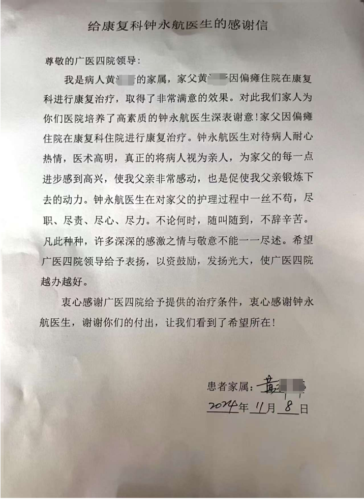信中,患者黃大爺?shù)募覍賹︾娪篮?/span>同學給予了高度評價。黃大爺因偏癱住院,在廣醫(yī)四院康復(fù)科進行康復(fù)治療。在治療期間,鐘永航傾注了極大的耐心與熱情,確保每一個康復(fù)動作都能精準到位,每一個訓(xùn)練環(huán)節(jié)都能達到預(yù)期效果,為患者的每一次進步感到由衷的高興。鐘永航不僅展現(xiàn)了其專業(yè)技能的精湛,更以一顆溫暖而堅定的心,贏得了患者及家屬的深深信賴。