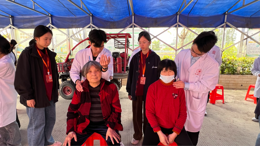 服務(wù)過程中,學(xué)生志愿者們始終恪守“不診斷、不開方”的專業(yè)原則,遇到疑問及時向帶隊老師請教,確保每一項服務(wù)都安全規(guī)范。秩序接待組的同學(xué)耐心安撫等候的老人,主動幫忙搬椅子、遞溫水;宣傳記錄組的同學(xué)拿著相機穿梭現(xiàn)場,定格下師生協(xié)作服務(wù)、村民笑容滿面的暖心瞬間;后勤保障組的同學(xué)則時刻關(guān)注物資補給,保持場地整潔,讓整個義診活動高效又溫馨。