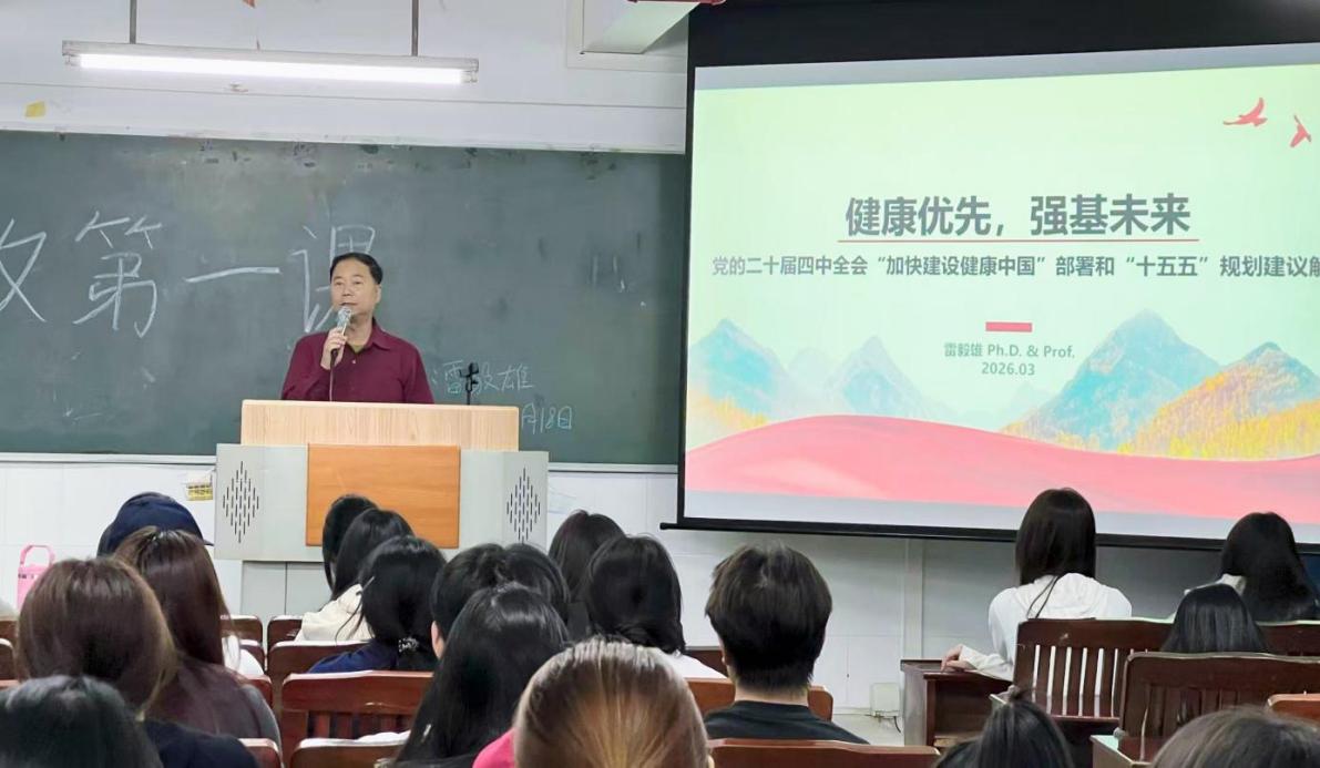 2026年3月18日晚,健康學(xué)院新學(xué)期思政第一課在西三教學(xué)樓601教室開講,課程以“健康優(yōu)先,強(qiáng)基未來”為主題,深入學(xué)習(xí)貫徹黨的二十屆四中全會(huì)精神,引導(dǎo)青年學(xué)子深刻領(lǐng)會(huì)“加快建設(shè)健康中國”戰(zhàn)略部署和“十五五”規(guī)劃建議核心要義,厚植服務(wù)人民健康事業(yè)的使命擔(dān)當(dāng)。本次課程由健康學(xué)院院長雷毅雄同志主講,學(xué)院學(xué)子齊聚課堂、專注聆聽,在學(xué)習(xí)中凝聚思想共識(shí)。