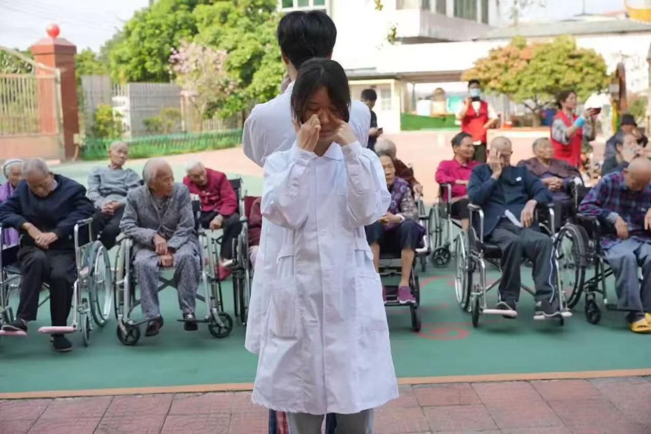 此外,志愿者們結(jié)合健康專業(yè)特色,精心設(shè)計眼保健操教學(xué)環(huán)節(jié)??紤]到老人們?nèi)粘Q鄄恳灼诘膯栴},志愿者們一邊規(guī)范示范動作,一邊耐心講解要領(lǐng),帶領(lǐng)老人們一起做眼保健操,幫助放松眼部肌肉、緩解疲勞,以實際行動傳遞科學(xué)護(hù)眼的健康理念。