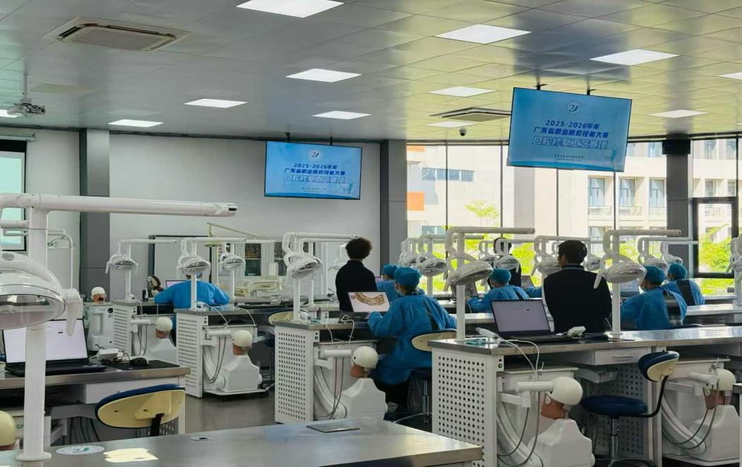 在技能大賽的緊張賽場上,選手們?cè)谂鋫溆邢冗M(jìn)設(shè)備的牙科操作臺(tái)前展開角逐,展現(xiàn)了高超的職業(yè)素養(yǎng)與技能水平 。