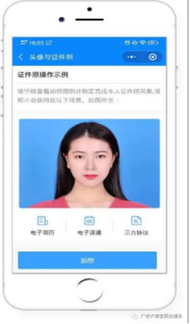 第五步:點(diǎn)擊“我的簡歷”中的頭像,上傳符合要求的免冠照片,系統(tǒng)即可快速生成藍(lán)色背景的證件照片。照片可適用于簡歷、派遣、電子就業(yè)協(xié)議等系統(tǒng)中的多個(gè)服務(wù)場(chǎng)景(證件照片經(jīng)過公安部后臺(tái)校驗(yàn),符合國家證件照標(biāo)準(zhǔn))。
