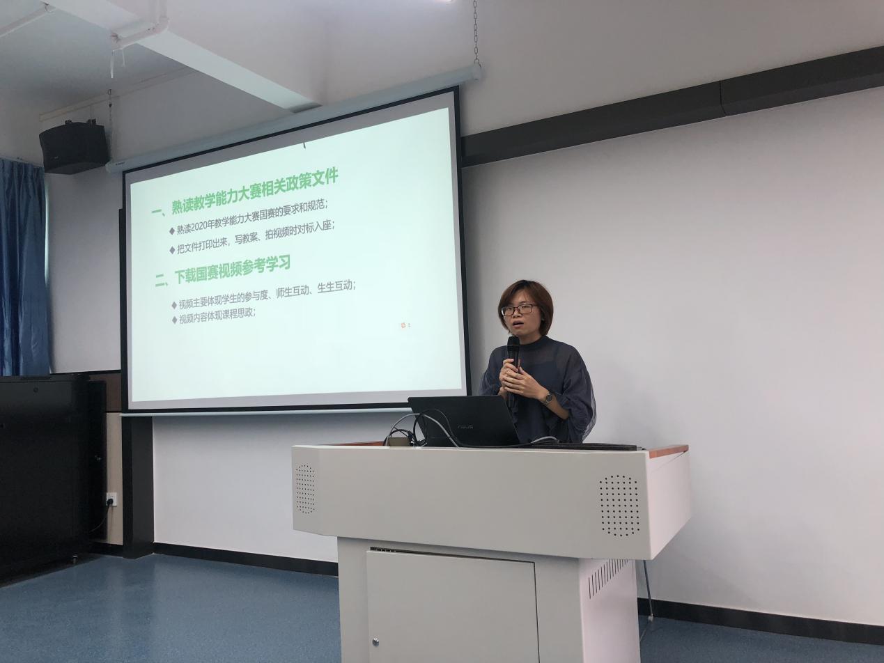 吳老師對教學(xué)能力大賽前期準(zhǔn)備工作分五個(gè)方面作了分享。強(qiáng)調(diào)老師要熟讀教學(xué)能力大賽的相關(guān)政策文件、下載國賽視頻參考學(xué)習(xí)及在教學(xué)團(tuán)隊(duì)建設(shè)、課程選擇等相關(guān)注意事項(xiàng)。最后播放了去年獲獎(jiǎng)的教學(xué)能力大賽的視頻,對視頻的拍攝和教案的撰寫要求分享了她的看法。