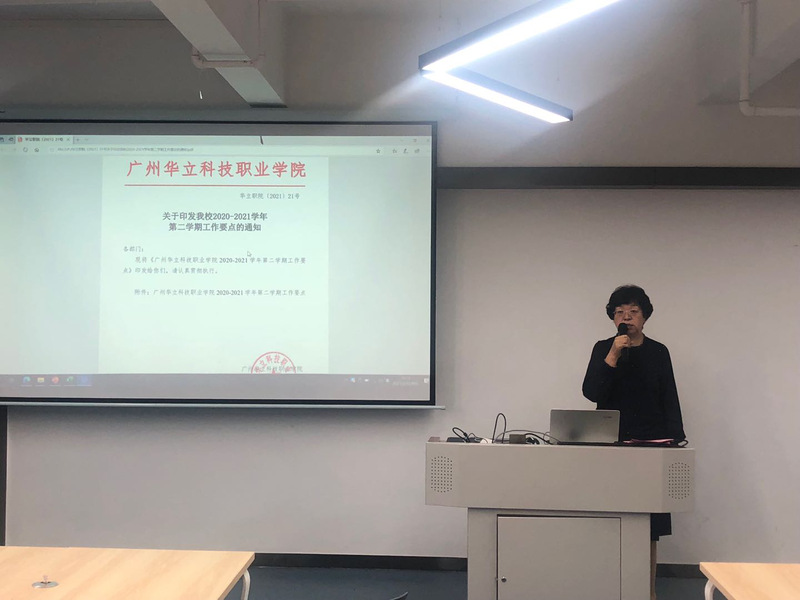行政人事副主任楊雪玲老師向全體教師傳達了2020-2021廣州華立科技職業(yè)學院第二學期的工作要點通知,全體教師進行了熱烈的討論。校內(nèi)教學副主任閔小翠老師圍繞專業(yè)群建設和升本工作進行布置,首先是新學期任課老師分系情況;其次是計算機學院專業(yè)群建設、升本工作團隊;第三是本學期教學任務安排;第四是省教學能力大賽的準備工作;最后是省級質(zhì)量工程與1+X證書的工作。校外教學干事黃志強老師對本學期18級校外實習學生的校友任務進行安排,強調(diào)各校外老師要督促學生完成校友邦實習任務1-4。