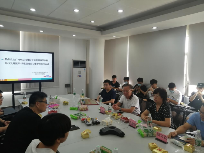 9月13日,中秋佳節(jié)之際,廣州華立科技職業(yè)學(xué)院黨委書記林偉健、計(jì)算機(jī)信息工程學(xué)院院長(zhǎng)王建華、校外教學(xué)副主任蔡文欽、校外干事黃志強(qiáng)老師一行到北京云百訊科技有限公司佛山分公司看望2019級(jí)跟崗實(shí)習(xí)的65位學(xué)生,開展中秋節(jié)慰問活動(dòng)。