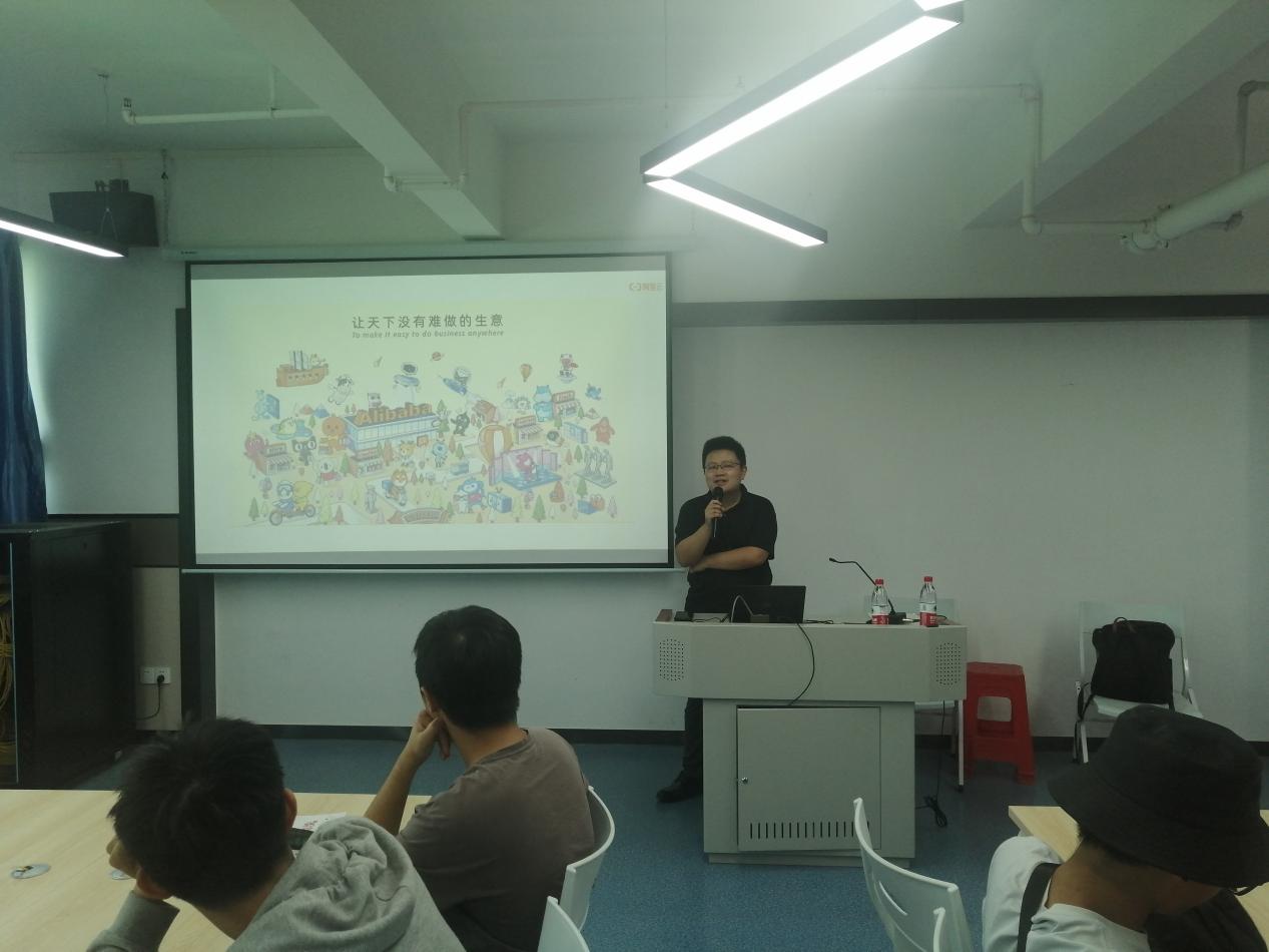 講座開始前,吳主任對(duì)本次講座的主要目的和企業(yè)講師作了簡(jiǎn)短的介紹。其后鄭經(jīng)理從阿里巴巴集團(tuán)的使命、愿景、價(jià)值觀和企業(yè)文化等方面,為同學(xué)們介紹了阿里巴巴行業(yè)技能認(rèn)證的供需背景。鄭經(jīng)理以圖文結(jié)合的方式介紹了阿里云云計(jì)算開發(fā)與運(yùn)維職業(yè)技能等級(jí)證書面向的崗位以及崗位和具備技能的需求關(guān)系。