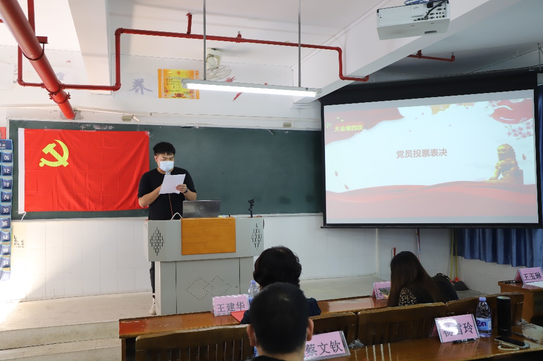 接著是全體正式黨員教師的投票表決,由溫??M颈O(jiān)票,王明偉同志公布投票結(jié)果,同意14名發(fā)展對(duì)象轉(zhuǎn)為預(yù)備黨員。