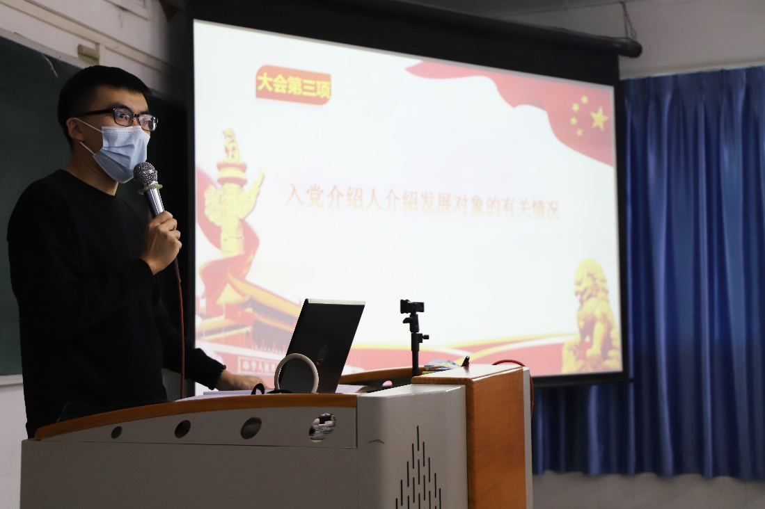 緊接著,陳江鴻同志介紹了發(fā)展對(duì)象的在校表現(xiàn),表示謝浩賢等14位發(fā)展對(duì)象的政治立場(chǎng)堅(jiān)定,工作踏實(shí)努力,學(xué)習(xí)勤奮,符合黨員發(fā)展。并強(qiáng)調(diào)新一批的預(yù)備黨員要時(shí)刻牢記使命、不斷學(xué)習(xí),不斷的提高自己,在思想上與行為和黨保持高度一致。