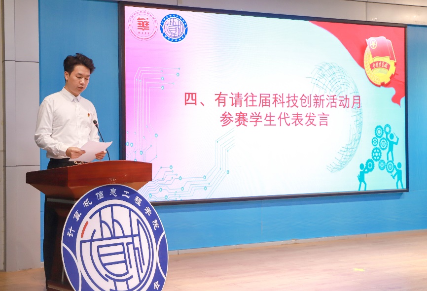 最后由往屆科技創(chuàng)新活動(dòng)月參賽學(xué)生蘇洲同學(xué)代表發(fā)言,蘇洲同學(xué)分享了參加第一屆“數(shù)據(jù)引擎,智馭未來”科技創(chuàng)新活動(dòng)月系列活動(dòng)的心得,鼓勵(lì)大家積極參與,并預(yù)祝本屆“賡續(xù)百年榮光,勇攀科創(chuàng)高峰”科技創(chuàng)新活動(dòng)月取得圓滿成功!
