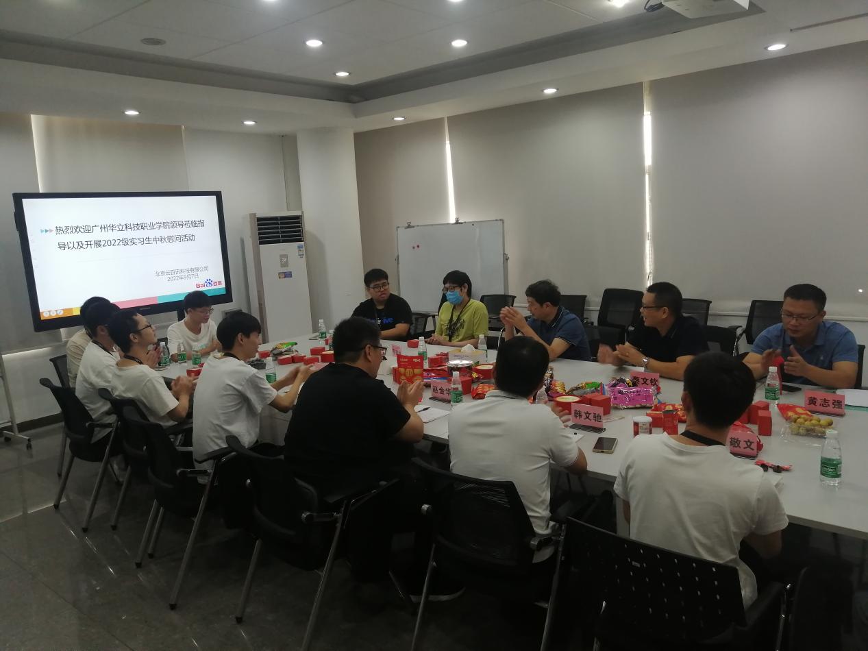 9月7日,中秋佳節(jié)之際,廣州華立科技職業(yè)學(xué)院校長易健民、校外教學(xué)與就業(yè)管理處副科長韋建林、計算機信息工程學(xué)院辦公室主任蔡文欽、校外教學(xué)副主任黃志強老師一行到北京云百訊科技有限公司佛山分公司看望2020級實習(xí)學(xué)生,開展中秋節(jié)慰問活動。
