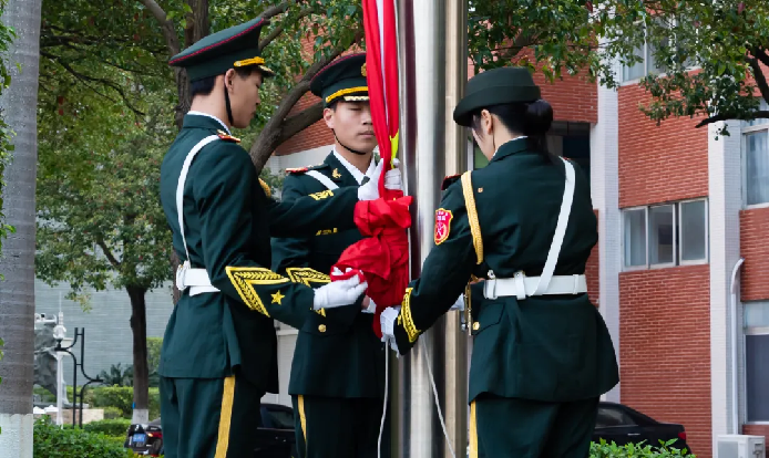 升旗儀式開(kāi)始,國(guó)旗護(hù)衛(wèi)隊(duì)的旗手們邁著鏗鏘有力的步伐,護(hù)衛(wèi)鮮艷的五星紅旗入場(chǎng)。五星紅旗冉冉升起,全體師生面向國(guó)旗,奏唱國(guó)歌,行注目禮,以飽滿的精神狀態(tài)向祖國(guó)致敬,表達(dá)對(duì)祖國(guó)母親的無(wú)限熱愛(ài)之情。