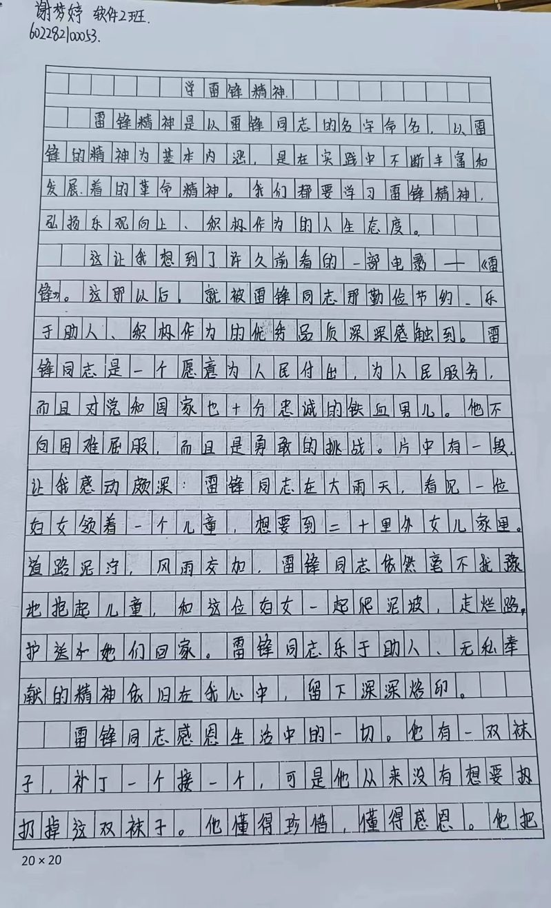 深化學(xué)雷鋒活動(dòng)掀起學(xué)院學(xué)雷鋒活動(dòng)新高潮,不斷豐富和發(fā)展新時(shí)期學(xué)雷鋒活動(dòng)的內(nèi)涵和形式,樹立當(dāng)代優(yōu)秀大學(xué)生的優(yōu)良形象。計(jì)算機(jī)信息工程學(xué)院于2023327日開展“學(xué)習(xí)雷鋒精神”為主題的征文活動(dòng),希望每一位計(jì)算機(jī)學(xué)院的同學(xué)可以通過手中的筆,為身邊的人送去一份愛心,送上一份祝福。