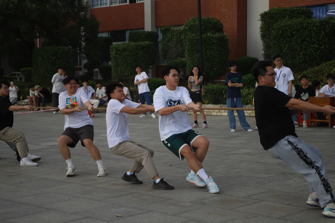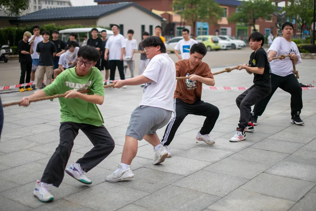 正午的陽(yáng)光顯得格外耀眼。參賽隊(duì)員們?cè)缭鐏?lái)到賽場(chǎng)。各組陳兵列陣、摩拳擦掌、躍躍欲試。當(dāng)比賽開(kāi)始的哨聲響起,隊(duì)友們?nèi)季o握繩子,憋足了勁把繩子往后拉。同學(xué)們?cè)谂赃厼樽约旱陌嗉?jí)加油吶喊著,每個(gè)人都恨不得抓起繩子跟選手一起努力,使得整個(gè)場(chǎng)面既激烈又溫馨。