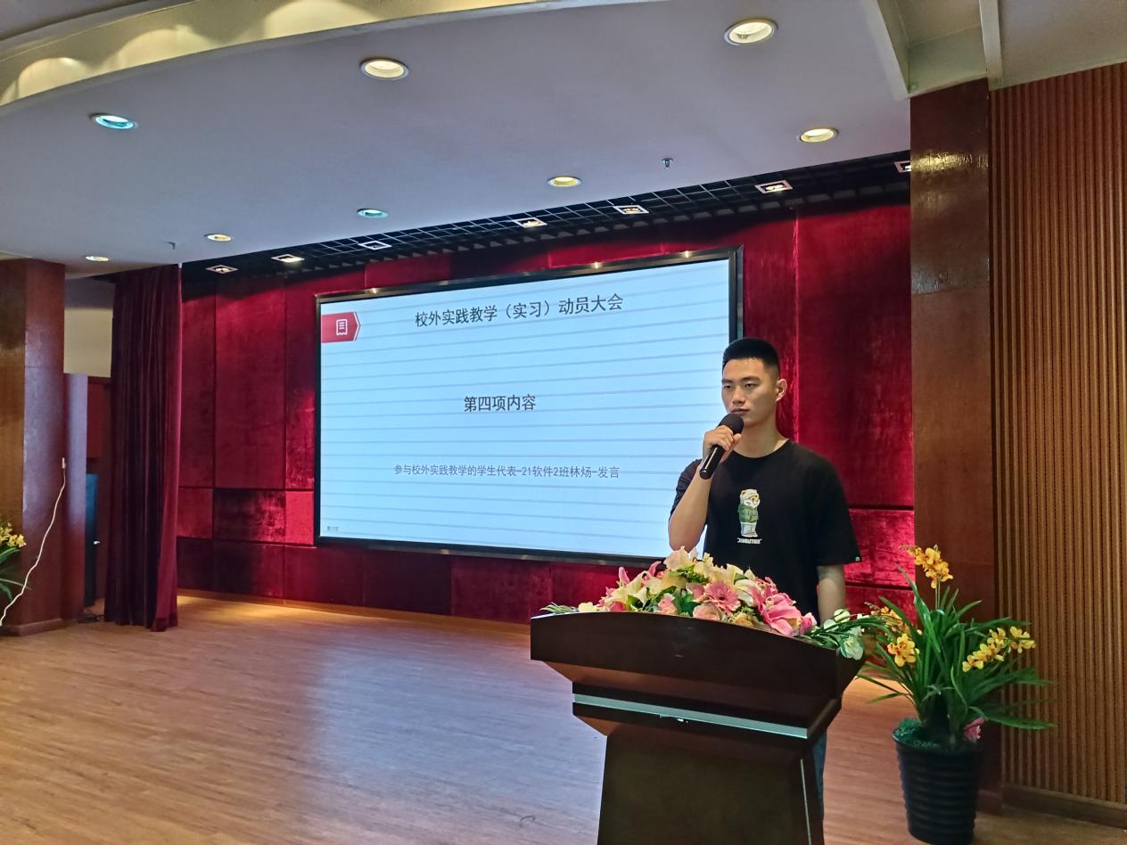 然后是參與校外實踐教學的2021級學生代表發(fā)言:會時刻牢記;走進學校是主人,走出學校是代表。我們將在社會上以優(yōu)異的實習成績,展示自己的才華,證明自己的價值,回報師長,回報母校,回報一切關(guān)心我們的人。